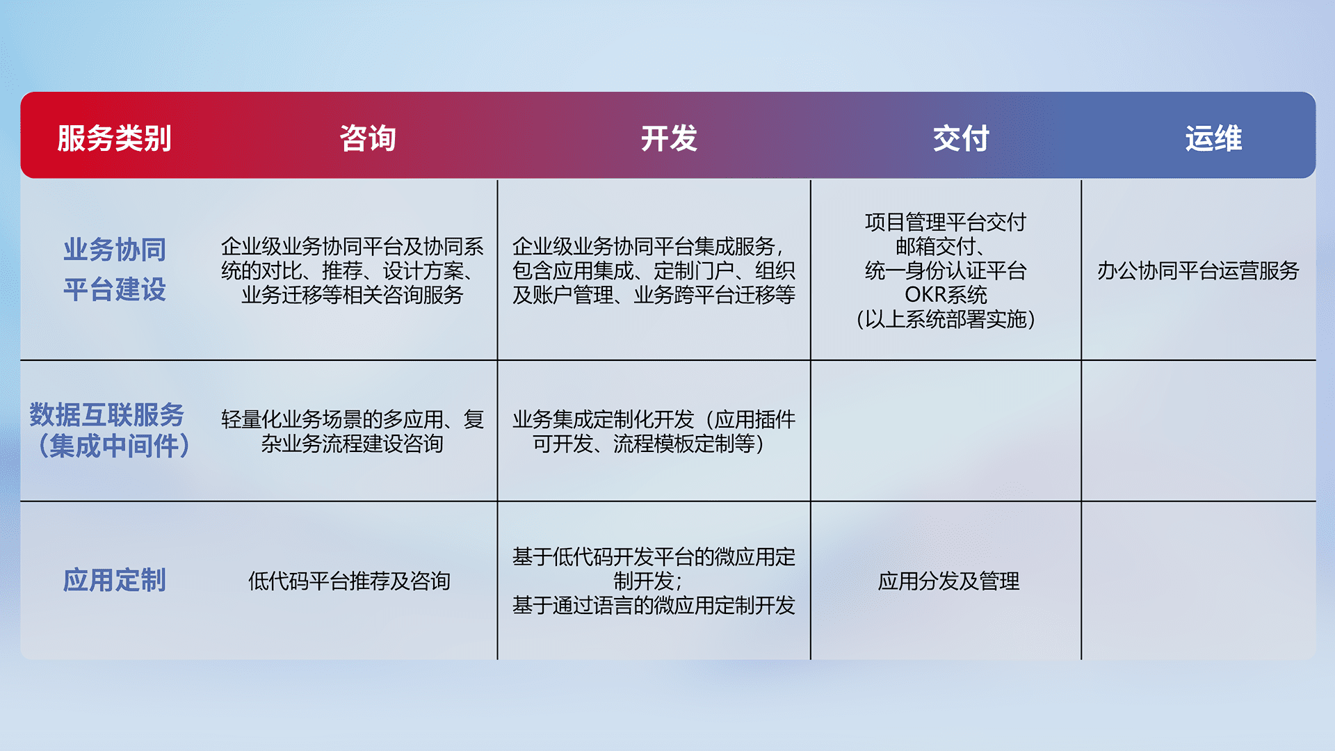 针对钉钉、、企微、、IDaas等平台级产品提供产品的规划、、、、方案、、、交付、、定制化开发等服务,,实现如统一协同办公、、、、智能客户服务、、混合会议管理、、、、智能数据查询、、、等业务场景,,实现数字化转型。。。。